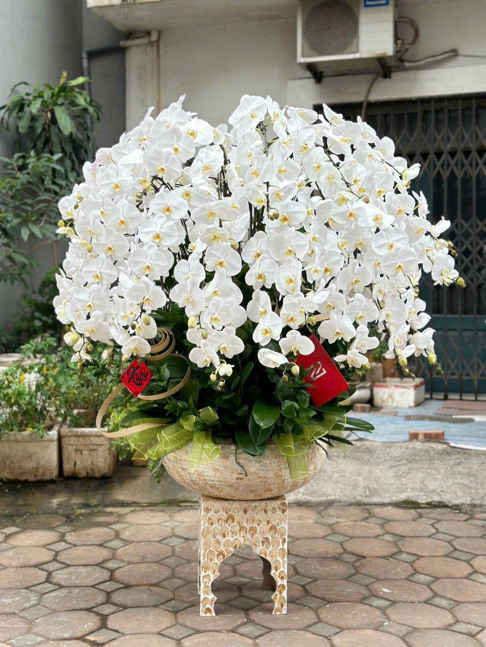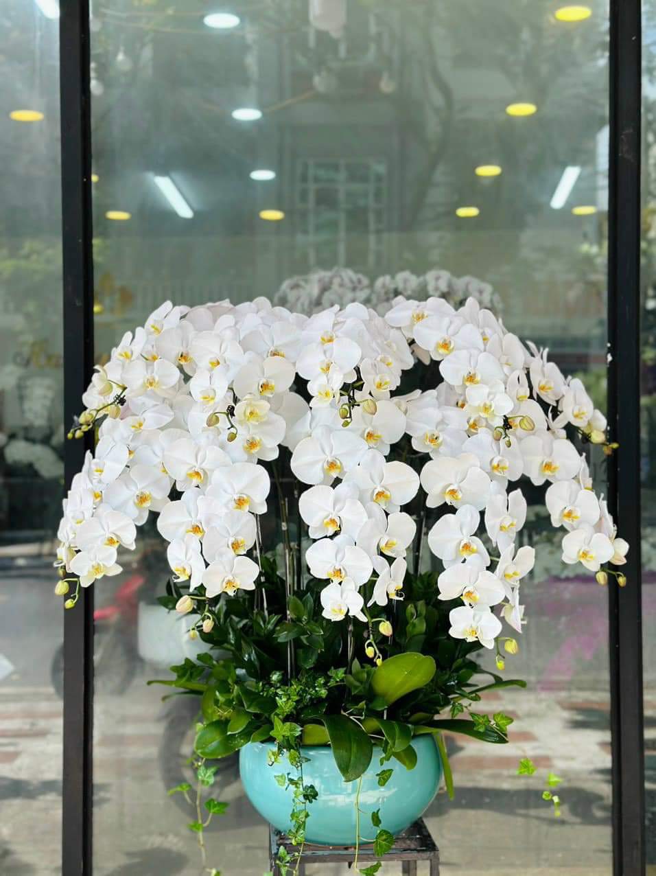 Hoa lan trắng được cách điệu rủ xuống tựa như một mái vòm đầy kiên cố thanh lịch